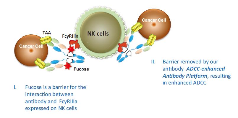 抗体依赖性细胞毒性(ADCC)是一种先天免疫机制,通过该机制,携带FcγRIIIa的NK细胞可识别并杀死被抗体识别的靶细胞。 ADCC增强型抗体平台的开发目标是增强抗体与FcγRIIIa结合的效力,因此能够大幅增强ADCC效果。如下图所示,岩藻糖是抗体与NK细胞上表达的FcγRIIIa之间相互作用的屏障,而由我们平台开发设计的敲除岩藻糖的抗体对FcγRIIIa具有更高的亲和力及稳定性。该机制显著提高了抗体的ADCC效果及治疗效率。